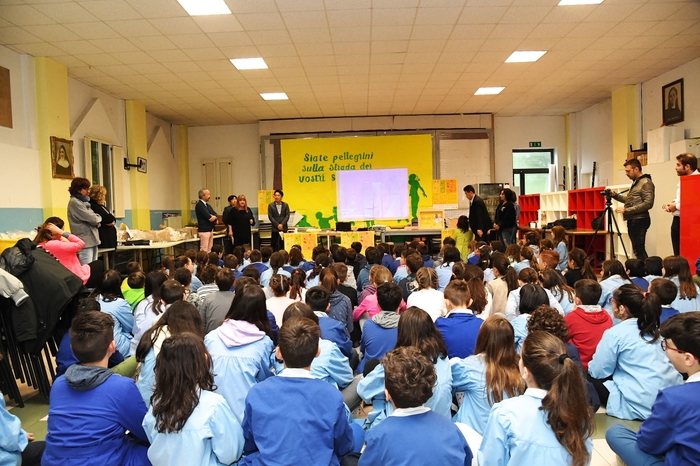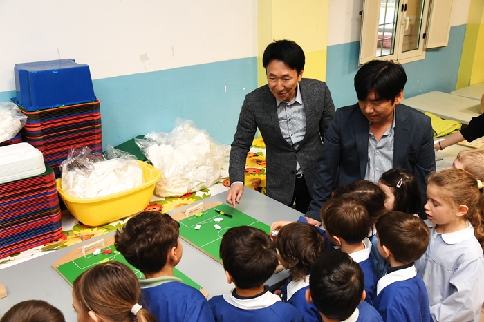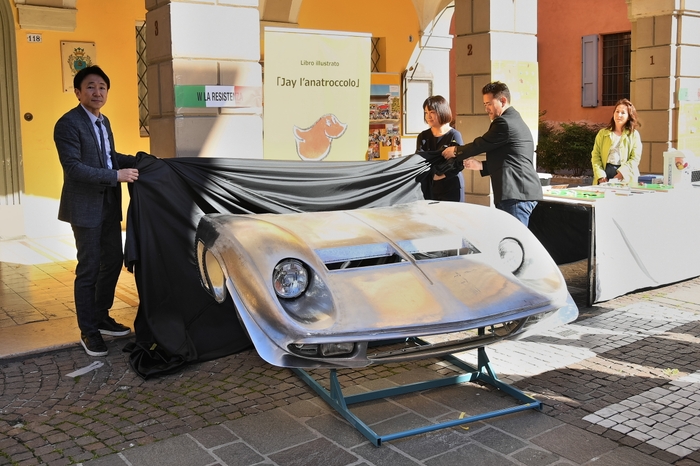今回はそのランボルギーニ・イオタ生誕50周年に合わせて世界各地で作られた“クローンイオタ”(オリジナルの実車は存在しない)やファンが集結する中で、絵本「アヒルのジェイ」及び、現在製作中であるイオタのアルミオブジェ(フロント部分)のワールドプレミアを行いました。また2日後の4月29日には、サンタアガタの小学校、幼稚園の生徒たちに、授業の一環として絵本「アヒルのジェイ」を紹介し、このアルミオブジェを披露しました。