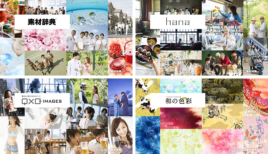 『素材辞典』をはじめ、高感度なクリエイティブ画像をそろえた『QxQ IMAGES』、現代のセンスで新しい和のイメージを表現した『和の色彩』、ごく自然なリアルライフをテーマにした『hana』から、合計約9万点の画像を提供します。