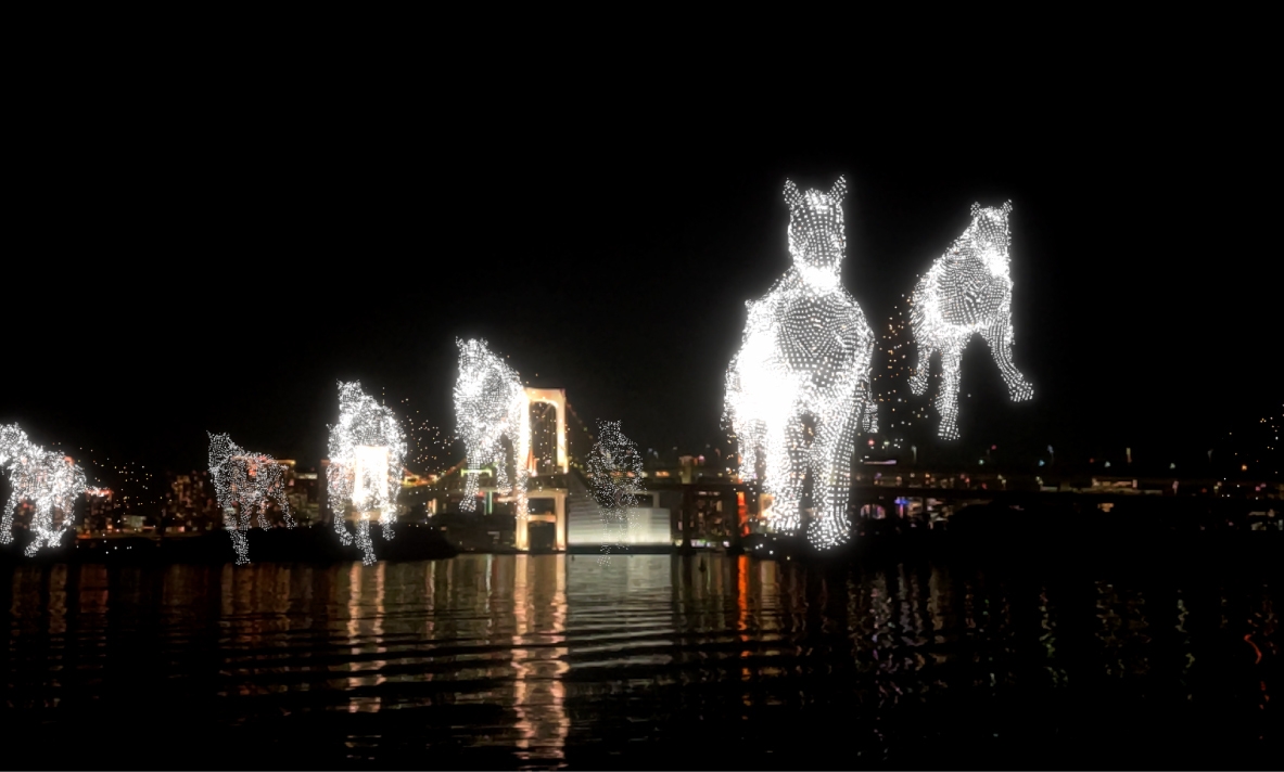 AirMappingShow(エアーマッピングショー)は、夜空の3次元空間上にAR(拡張現実)の技術で映し出される光と音で奏でる3D映像作品です。光の粒子が立体的に集合し、形状を変えながら夜空の3次元空間で動き、輝きます。