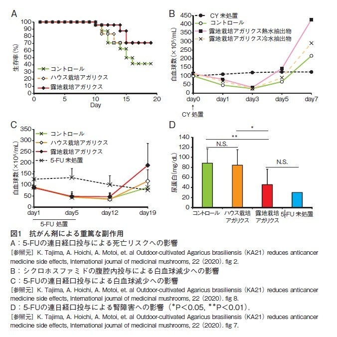 シクロホスファミドによる白血球減少症では、露地栽培アガリクスの摂取によって白血球数の回復が促進されることが報告されている(図1B)。5-FU投与による白血球減少症では、5-FUを連日経口投与した後、白血球数の回復促進作用がアガリクスの栽培条件に影響を受けることが報告されており、露地栽培のアガリクスはハウス栽培されたアガリクスより回復促進活性が高いことが報告されている(図1C)。
