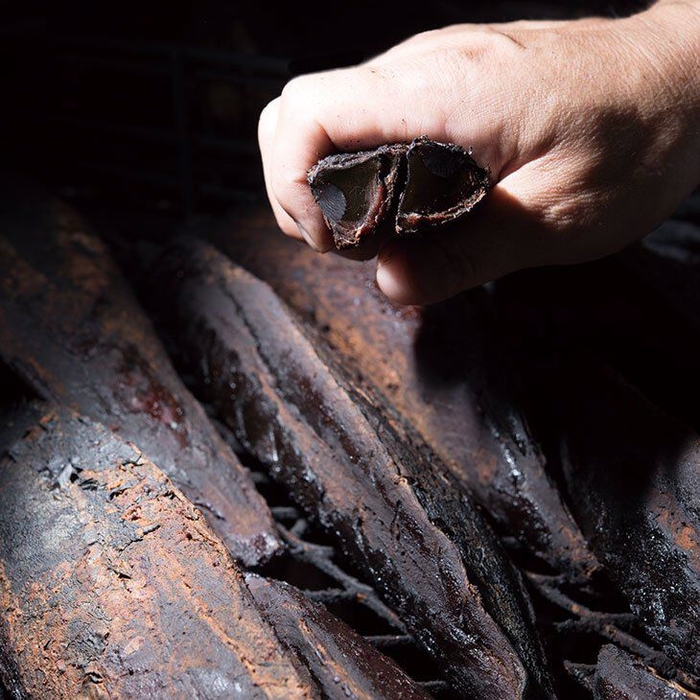 竹ノ内さん:究極の旨みが味わえるだしパックを目指して、とにかく鰹節にこだわっています。使っている鰹節は、華やかな香りと豊かな風味が特徴的な「荒節」。「荒節」は1カ月ほどの時間をかけて、薪の煙でいぶして作る真っ黒な鰹節です。