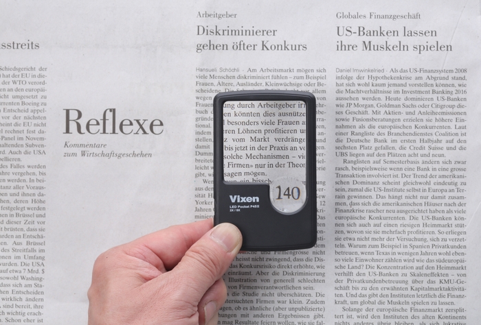 45×45mmの角型ルーペ(2倍)は適度な拡大率が得られ、文字を読む際に便利です。