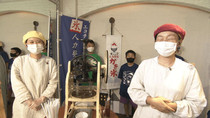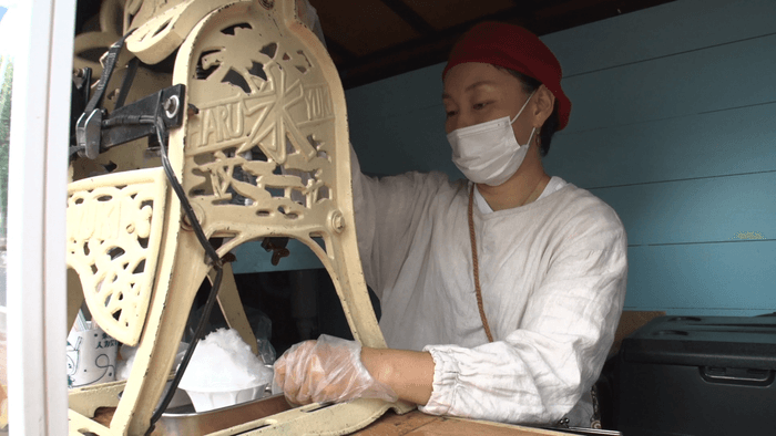 熱々の焼き芋はさすがに夏には売れないため、かき氷の販売をはじめたいも子さん。自転車のペダルを漕いで氷を削るエコロジーでユニークな仕掛けと、子どもたちの健康を考えた無添加シロップに注目です。
