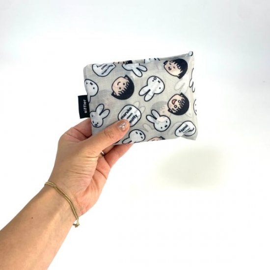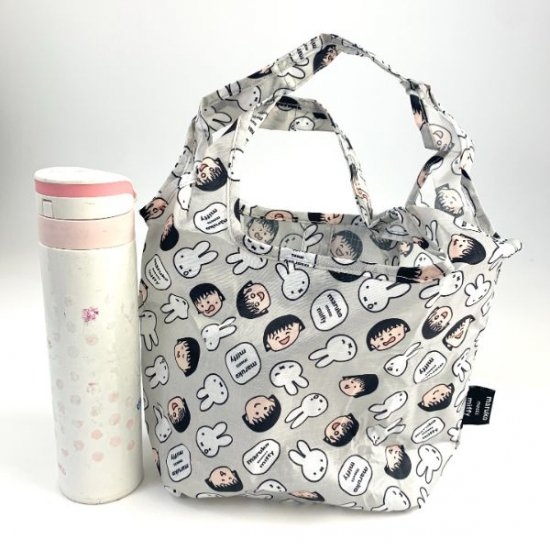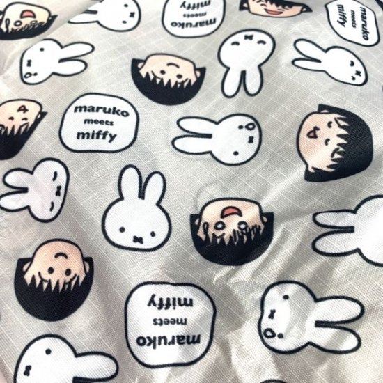表情豊かなまる子と、泣いているミッフィーが珍しいデザインです。この商品は「maruko meets miffy」と呼ばれるシリーズで、ほかにもたくさんある商品のなかのエコバッグライン。エコバッグにも「maruko meets miffy」のロゴが入っています。