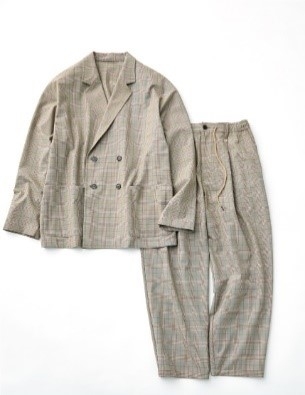 フランスの〈DELEGANT〉社のテキスタイルを使用。2WAYストレッチで動きやすく、トレンド感のあるダブル仕様のボックスシルエットに、パンツは今を感じるバルーン型。自宅で洗えるマシンウォッシャブル対応。