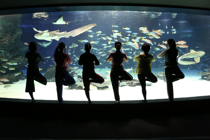 当日は閉館後の水族館内で大きな水槽を前にした特別講師によるヨガレッスンのほか、夜の水族館でゆっくりとした時間の流れをお楽しみいただけます。平日のお仕事終わり、一日の疲れをリフレッシュできる「水族館Nightヨガ」にぜひご期待ください。