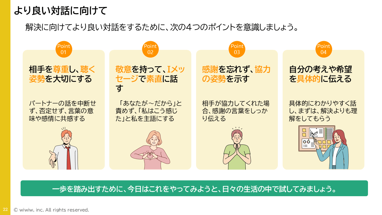 ・夫婦間のすれ違いを防ぐため、感情を伝える「Iメッセージ」や「対話型コミュニケーション」スキルを実践的に学べる