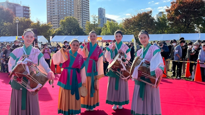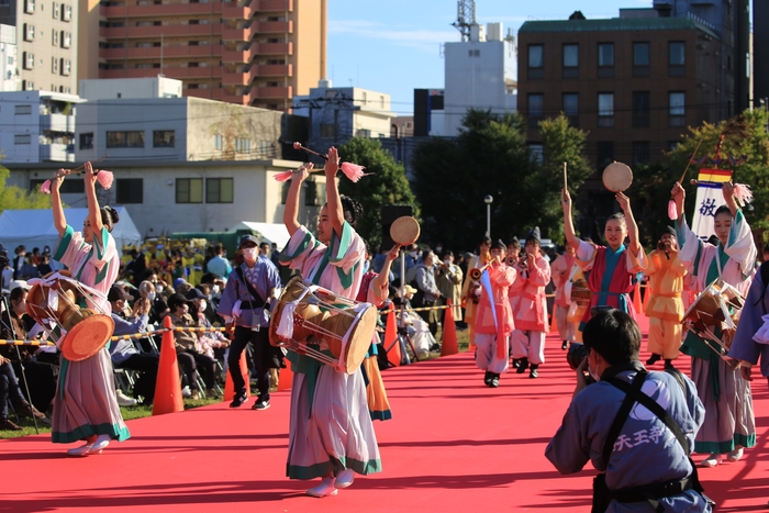 本学では2015年より、四天王寺ワッソに参加しており、今年は初めて2つの時代「高句麗・百済」の舞姫として演舞しました。