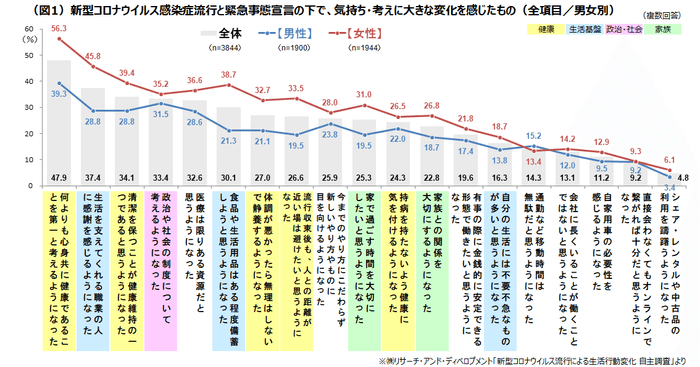 “健康”を留意する気持ちの変化は、総じて女性、特に60代女性で高い。自由回答には「あらゆる場所が清潔になり、人と距離を保てるようになれば、健康に留意しつつ暮らし、外出もできる」などの意見がある。また、「ご近所や友人との危機感の違いに悩む」など、感染予防に対する考え方の違いが人との関係性に影響を及ぼしている。