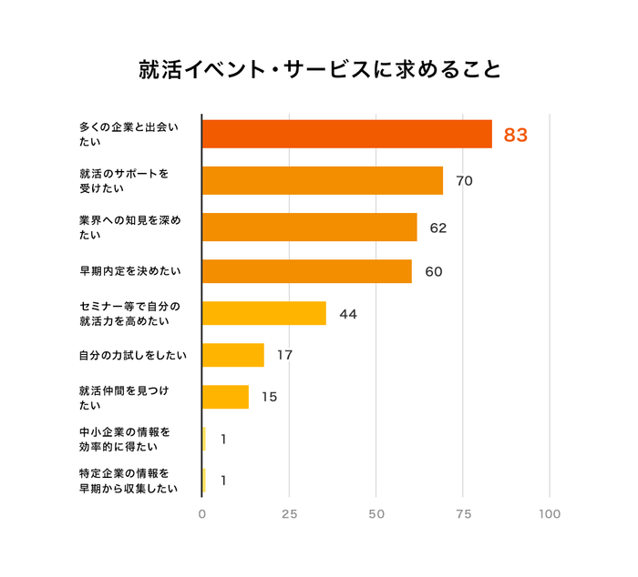 就活イベント・サービスに対し、「多くの企業と接触できる」、「就活サポートが得られる」、「業界研究ができる」、ことのニーズが強い結果になりました。また、早期内定を得たいニーズも強いことから、選考や内定に繋がるような就活イベント・サービスは、さらに利用意向が強くなるかもしれません。