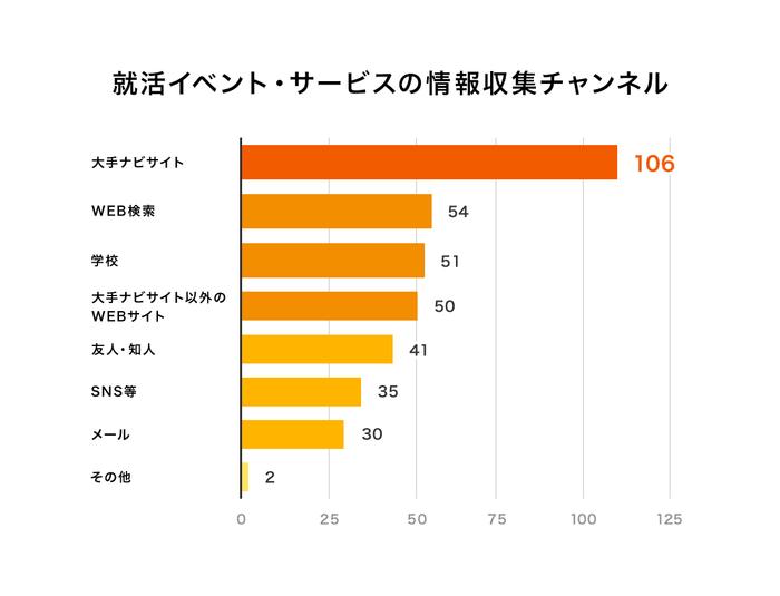 情報収集の方法としては大手ナビサイトを利用する学生が最も多いという結果になりました。ただしweb検索や、大手ナビサイト以外の就活サイト、学校からのお知らせで情報収集するという学生も一定数おり、複数のチャネルを併用して情報収集をしているようです。