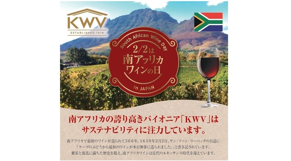 国分グループ本社株式会社では、日本の輸入ワイン市場における南アフリカワインをより多くの人に知ってもらうため、また、日本と南アフリカ共和国とのさらなる友好関係の構築を目的に、2月2日を「南アフリカワインの日」に定め、2017年に一般社団法人 日本記念日協会によって正式に認定されました。
