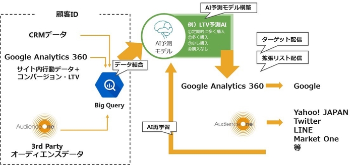 今回、アイレップとイー・エージェンシーは、顧客IDとGoogle アナリティクス 360 、AudienceOneが持つ独自のオーディエンスデータを掛け合わせることで、外部サイトでの行動情報を豊富にし、AI予測モデルの学習データを高精度化しました。これにより集客しやすい高LTVユーザーをリスト化(注2)し、ターゲティング配信もしくは類似ユーザーへの拡張配信を行います。