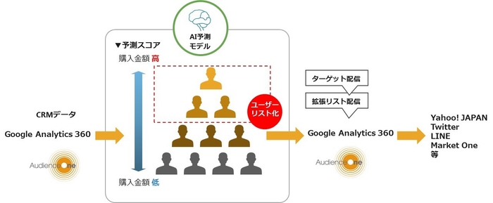 顧客を売上情報とサイト行動情報からリスト化し購入金額の高低等でゾーン分けを行う。そのリストにAudienceOneから外部サイト行動情報を紐付け、集客しやすい媒体やオーディエンス情報を付加してAI予測モデルでスコア化し、集客リストを作成。そのリストを基にAudienceOneで類似ユーザー拡張を行い、各広告媒体を通した広告配信で集客を実施する。さらにその広告配信データもAI予測モデルに取り込むことでモデルの精緻化を行う。