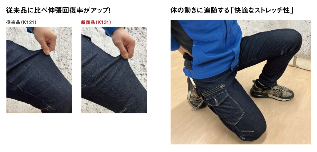 しかし、作業現場においては作業者の身を守る耐久性だけではなく、体を動かしやすいストレッチ性と長時間着ていても疲れない着心地が求められます。今回、より着心地の良いものとして商品化いたしました。特徴的なのはジャージライクな伸縮性を持ち、表は綾立ちの良い綿デニム、裏は滑らかなパウダリータッチの肌触りになっており、作業者に動きやすさと疲れにくさを与えてくれます。あらゆるワークシーンで活躍する事間違いありません。