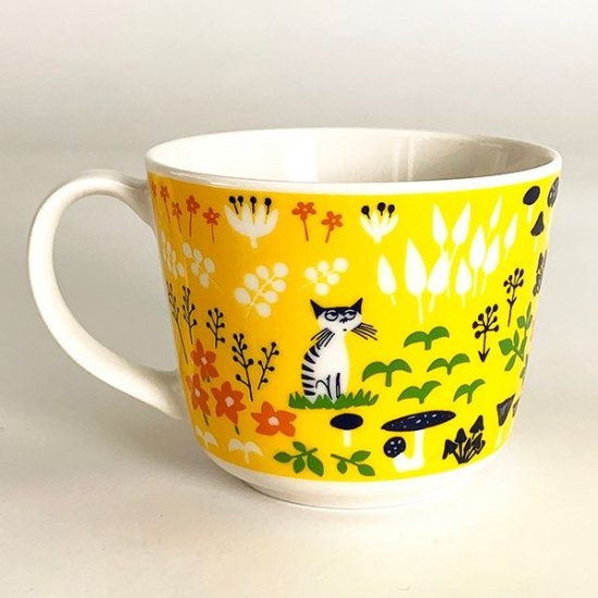 トレンドのボタニカルテイストなマグカップ、イエローです。キュートなお花やキノコが散りばめられていて、まるで森の中のよう♪