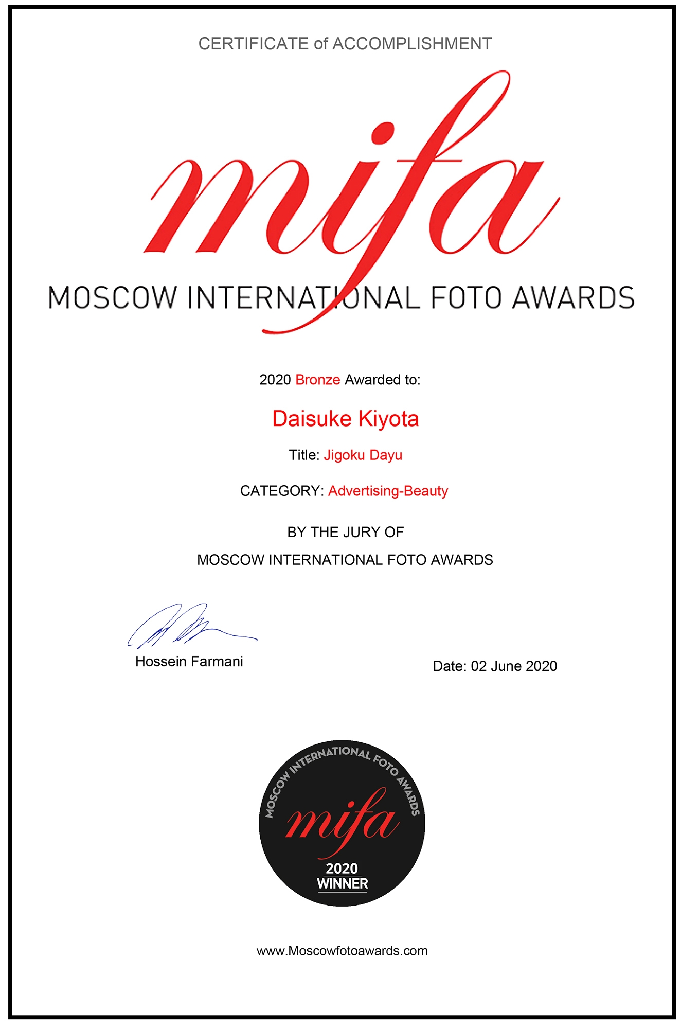 DreamPixels代表フォトグラファー「清田大介」が 国際フォトコンテストMIFAにて広告/ ビューティー部門(プロフェッショナル)のBronze(銅賞)を受賞