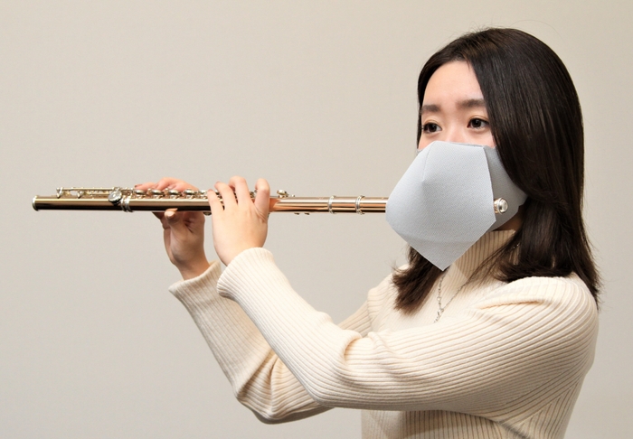 このフルート用マスクを使用すれば、演奏中に口元から出る飛沫を抑えたり、逆に外部からの飛沫を吸引する危険性を低下する効果が期待できます。さらにお伝えしたいのは、管楽器を演奏するときには他の奏者と打合せをしたり、レッスン中には先生から奏法の説明を受けたり、「話す」という動作が多く含まれますが、会話の最中にもちろんこのマスクを使えますし、そのままマスクを外すことなく演奏できる、というのは奏者のストレス軽減になるはずです。