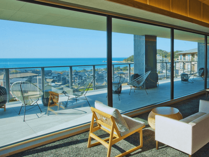 2023年春にオープンした、ゲスト専用の展望ラウンジ「碧 -AO-」からは、青い空と海、そして水平線に沈む夕日(冬は山側へと沈みます)、薄暮から漆黒へと移り変わるドラマチックな情景が望めます。