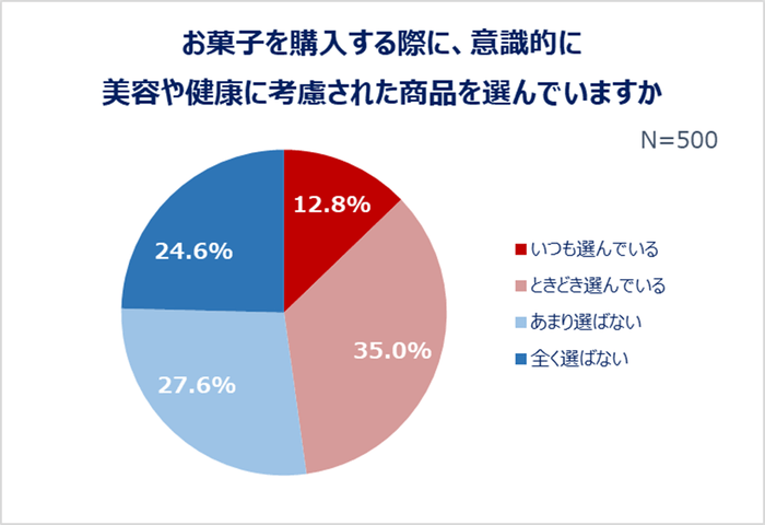 お菓子は日々の楽しみや気分転換になるものの、カロリーが気になる女性は多いと考えられます。近年は美容や健康に考慮されたお菓子も多く販売されていますが、お菓子を購入する際、意識的にそのような商品を選んでいるか質問したところ、約半数が美容・健康に考慮された商品を選んでいることが分かりました。