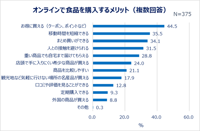 オンラインで食品を購入するメリットは「お得に買える(クーポン、ポイントなど)(44.5%)」と回答した人が最も多く、オンラインショッピングならではの特典を活用している人は多いようです。食品をオンラインで購入するとき気をつけていることは、「値段が適正か(50.1%)」「消費期限・賞味期限(34.7%)」「配送日数(32.0%)」といった声がありました。