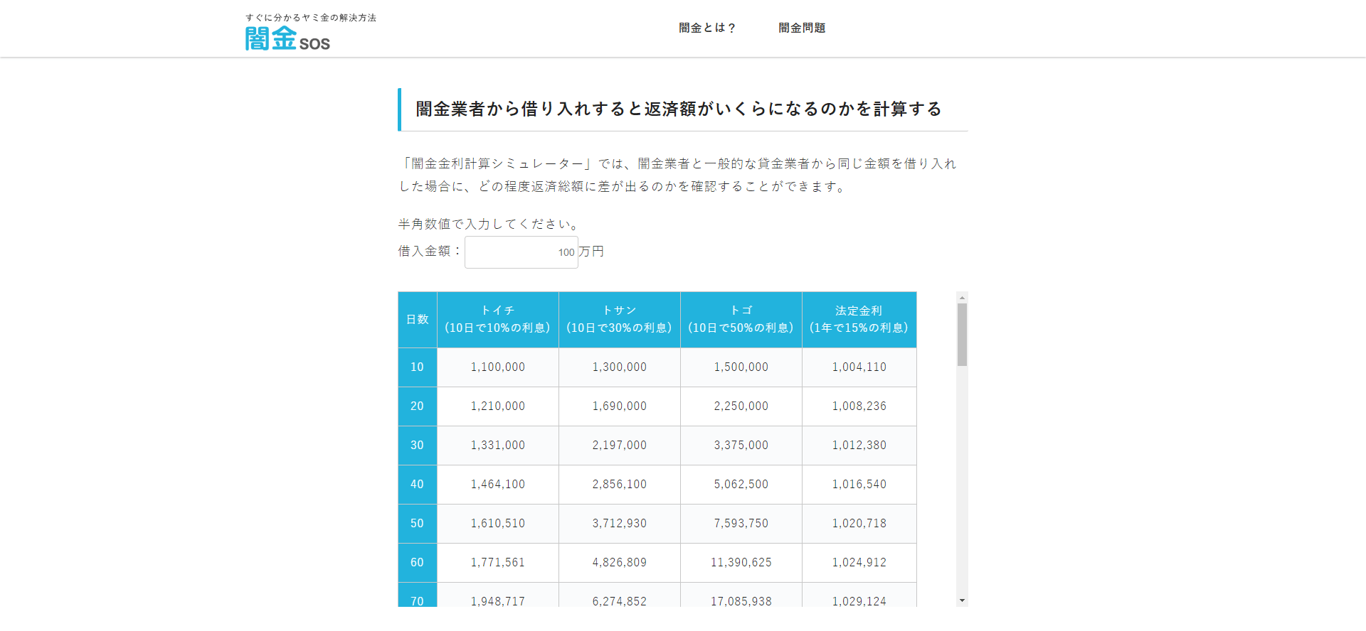 闇金の代表的な利息がトイチ、トサン、トゴです。闇金から借り入れた金額を入力すれば10日ごとの返済額がすぐに計算できます。法外な違法金利を知ることで闇金との取引抑止に繋がります。