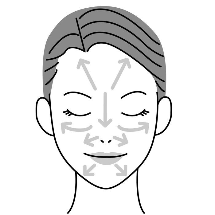 肌をこすらないように頬の広い面から、トントンと軽くたたきこむようになじませます。