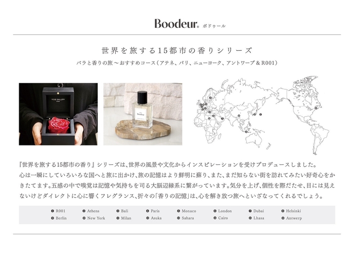 フレグランスブランド『Boodeur』の原点である「R001」の香りと、世界の風景や文化からインスピレーションを受けた「世界を旅する15都市の香り」で表現された16種の香りのラインアップ。ライフスタイルにおいて、「本質・上質」を知る人たちが、心地よく香りに包みこまれることを優先した、香りを愛する人たちのためのフレグランスです。「今」を心地よく過ごすため、自分らしくあるための香りを求めて。
