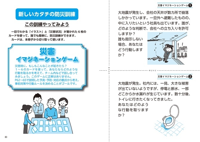 巻末には、学んだことをおさらいできる「防災イマジネーションゲーム」を掲載。防災の取り組み状況が診断ができるチェックシートも新たに掲載しました。付録の『防災ポケットBOOK』には、防災の豆知識や過去の災害の教訓を落とし込んだダイアリーやカレンダー、あったら役に立つアイテム、いざというときの連絡体制・連絡先を書き込めるメモ帳を載せています。