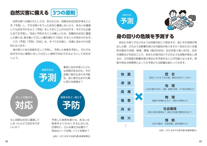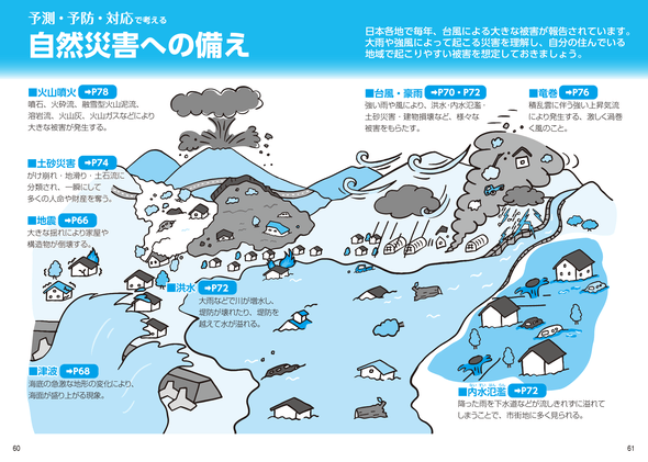 自然災害への備えとして、地震のみならず台風、豪雨、土砂災害、竜巻、津波などさまざまな自然現象を「予測」「予防」「対応」という共通の枠組みで考えることで、それぞれの災害への備えとして何をすべきかを解説しました。チェックシート形式でまとめ、家族や従業員といっしょに自己評価やグループ演習ができるように構成しています。