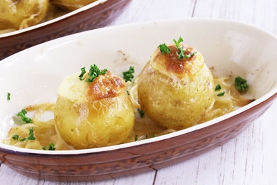 北海道産黄色系品種のSサイズを使用。暖かみのある色調でメニューを明るく彩ります。温めるだけで、ばれいしょの風味やホクホクとした食感をお楽しみいただけます。12個入りで個数管理がしやすく、必要な分だけ使える便利な商品です。