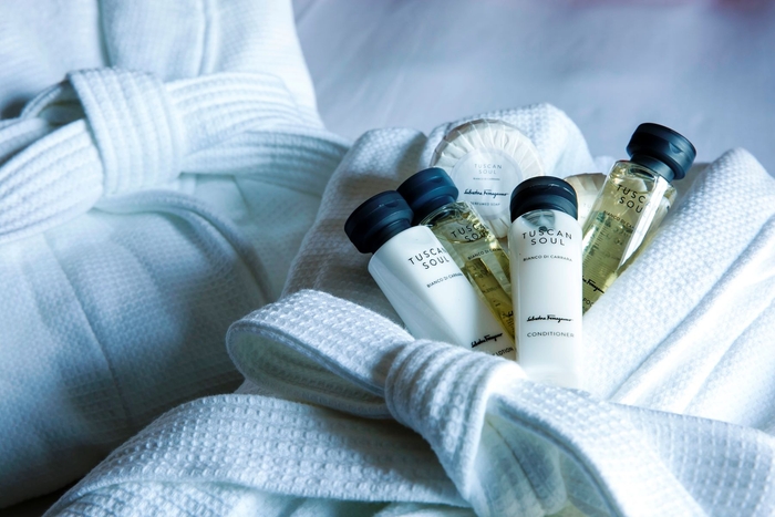 ①推しカラールームでのお泊りナイト ②ブッフェ朝食付(ホテル2階『Chef‘s Live Kitchen』 にて) ③フェラガモバスアメニティー4点セット付 ④大聖堂ビュー確約