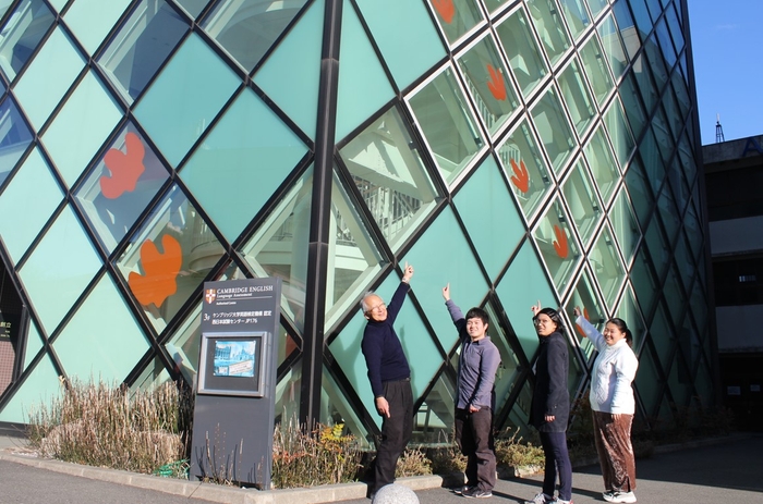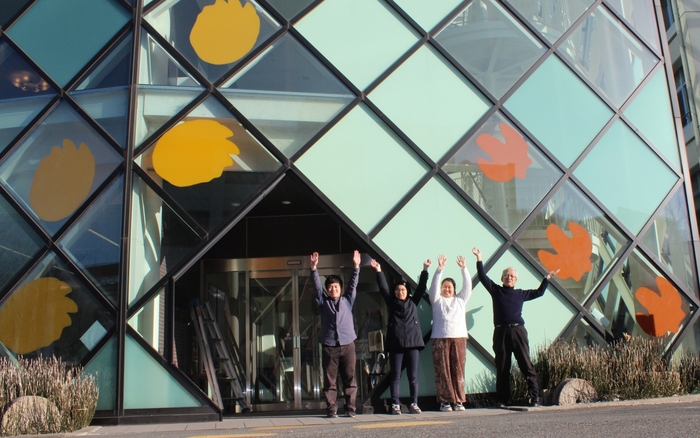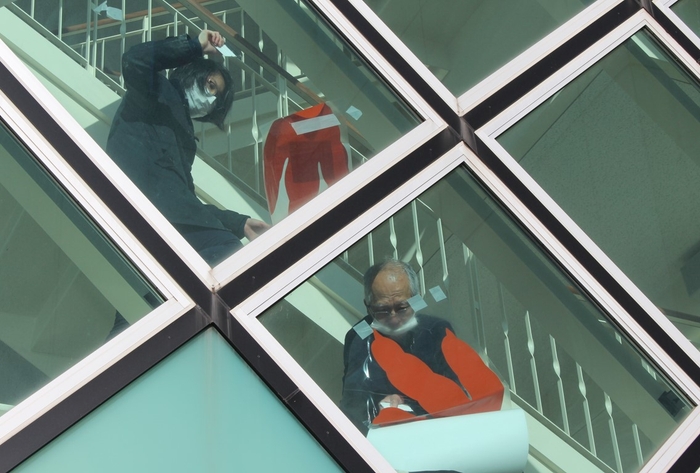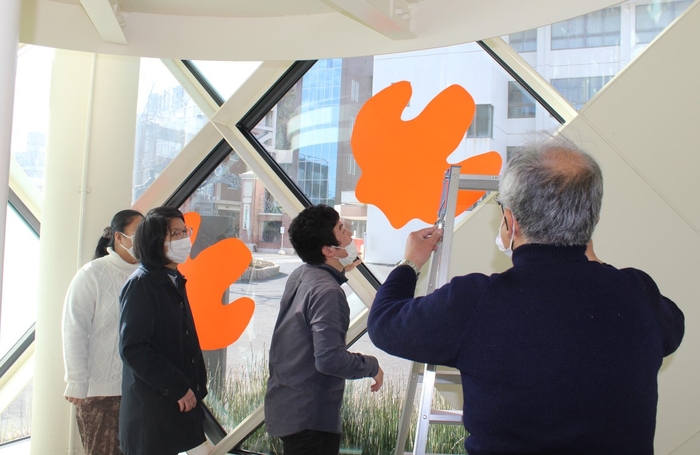 作業はこの日午後12時ごろスタート。石垣館長の指導を受けながら、学生たちはハシゴを使うなどして、ガラス壁面に次々に足跡のシールを張り付けていきました。通りがかった学生や教職員らは、キャンパスに突如出現した巨大な足跡に歓声を上げて早速、スマホで撮影する姿も見られました。