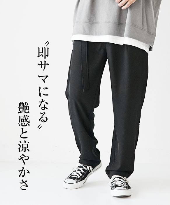 艶感のあるとろみ素材で、着こなしのアクセントになるベルトも付いています。