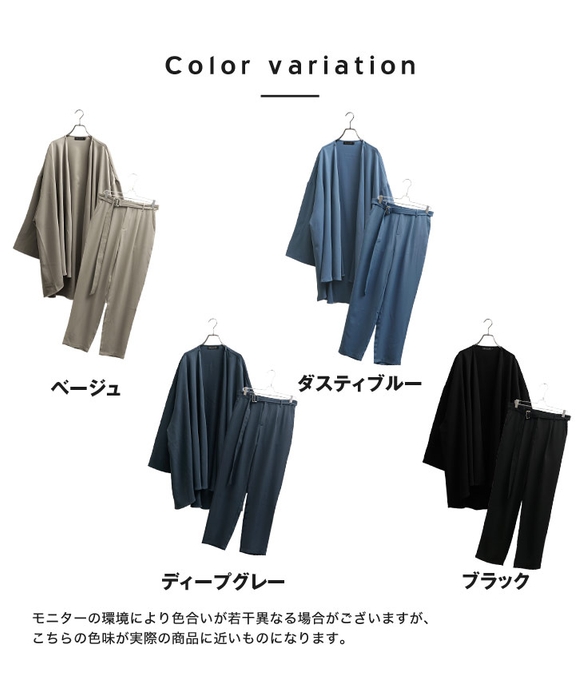 上品な艶感のある生地を採用したカーディガンとワイドパンツのセットアップ。