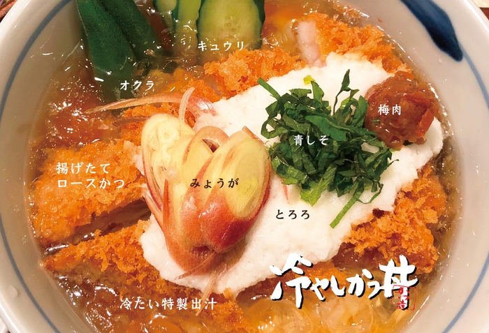 丁寧に取ったお出汁をベースに「特製醤油出汁」を作り、冷水で洗った白米の上に揚げたての「とんかつ」を盛り付けます。そこに夏野菜(みょうが・キュウリ・オクラ・青しそ)と梅肉、「とろろ」を盛り付け、クラッシュ氷で仕上げるかつ丼です。キンキンな冷たさでお召上がり頂きます!