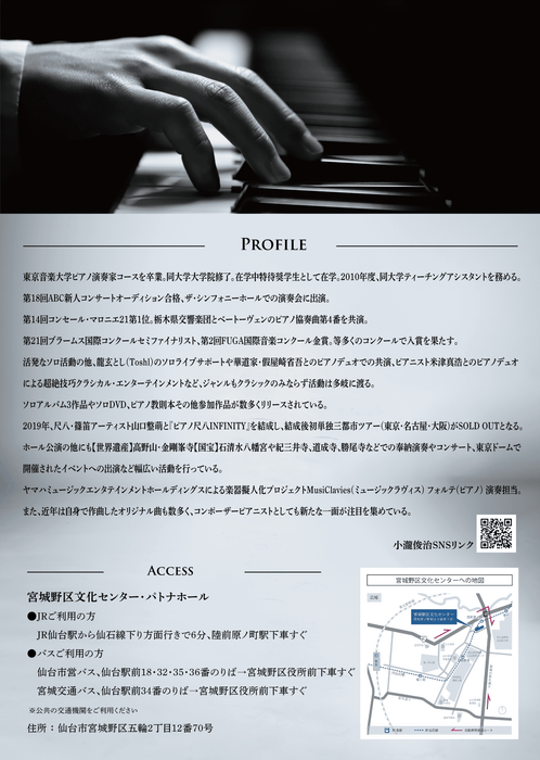 ソロ・アンサンブルピアニストとしてクラシックのみならず様々なジャンルの活動で注⽬を集めるピアニスト、⼩瀧俊治の約3年ぶりとなる故郷仙台でのソロリサイタルシリーズ第8弾となるコンサート。今回は⼤幅に客席数を減らして開催。