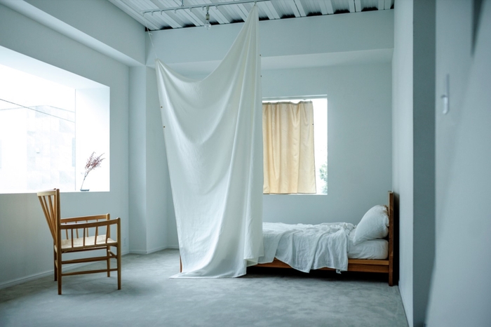 外からの視線を遮ったまま、透過した光をやわらかく拡散。その風情や存在感は障子ととてもよく似ています。一方、絹のようなしなやかさ、綿や麻にはない艶やかさもある、唯一無二の風合いをもっています。