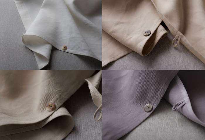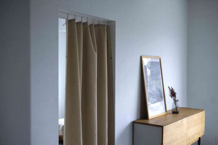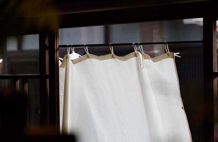 カーテンの製造過程で1日に出る廃棄生地は、全国で約3.4万t。それを解消するために生まれた『kami』を取り扱うブランド「KURASIKU(クラシク)」は、カーテンにプラスチックフックがなく生地に8つの穴をあけ布紐を通して掛けるスタイル(特許第6352496号)。ヒダやタッセルもないため、廃棄生地がほとんど出ない製造方法で作られています。