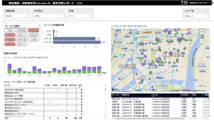 株式会社TRデータテクノロジー(本社:東京都中央区、代表取締役:田中 幹雄)は、当社が所有する福祉施設および介護保険の居宅サービスのビッグデータ(約23万件)を活用した「福祉施設・高齢者住宅 Data Base BI」の提供を10月1日より開始しました。