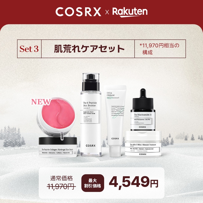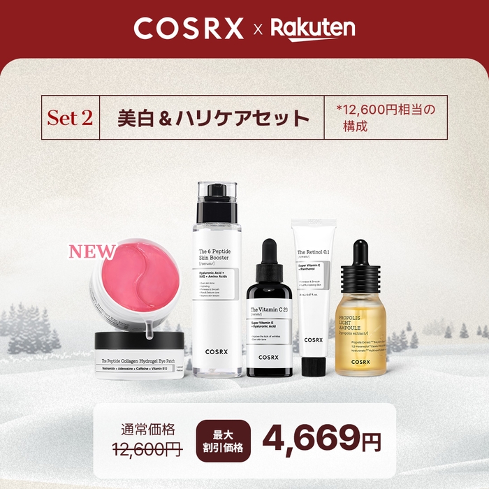 楽天市場のCOSRX公式ショップ限定で新商品「RXザ・ペプチドコラーゲンハイドロゲルアイパッチ」を販売いたします。本商品は菊地亜美さんが直接セレクトした乾燥する冬の保湿ケアのための製品のひとつで、菊池さんコラボの<保湿爆弾セット>をはじめ、<美白&ハリケアセット>、<肌荒れケアセット>の全てのセット構成に含まれています。