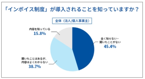 弥生株式会社による意識調査によると、「インボイス制度が導入されることを知らない事業者」が約45%、「聞いたことはあるが内容をよく知らない事業者」が約39%もいるそうです。