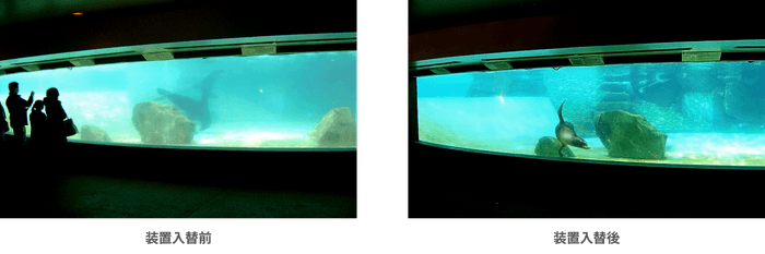課題 → アシカ池の水に濁りが発生し、水面下に設けた窓からアシカの泳ぐ姿がきれいに見えない。