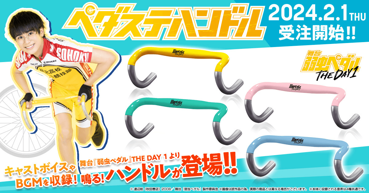 舞台『弱虫ペダル』シリーズより、主人公『小野田坂道』らが劇中で使用するハンドルを、「ペダステハンドル」と名付け、キャストボイスやBGMを搭載して商品化いたします。