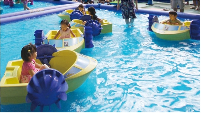 足湯を含む11の露天風呂を水着で楽しめる「スパニワ」の特設会場に、小学生以下のお子様対象のキッズボートが期間限定で登場します。