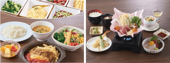 右:すき焼きや天ぷらなど、和食のご馳走がたっぷりの「千寿楼」レディース御膳
