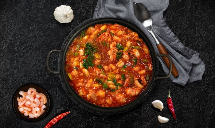 韓国釜山(プサン)の名物で、タコ・海老・牛ホルモンを使い、旨辛の特製ソースで煮込んだ韓国海鮮鍋料理です。