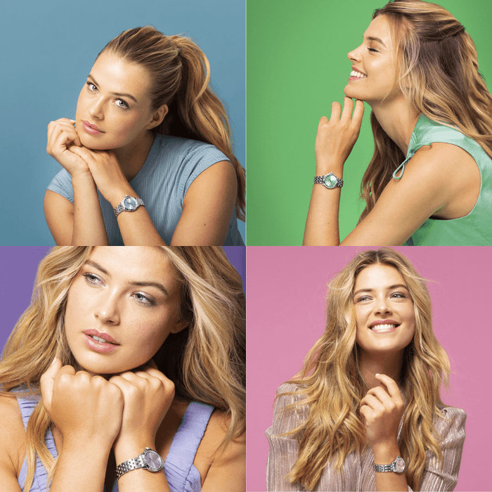文字盤カラーは、原色にグレーを混ぜたような淡いブルー・グリーン・ラベンダー・ピンクの4色で、コーディネートに自然に溶け込む絶妙なニュアンスカラーです。立体感と高級感のあるアプライド仕様のローマンインデックス・バーインデックスと、日常使いに便利な3時位置の日付表示を採用しています。サンレイ仕上げを施しているため、どの角度から見ても文字盤が美しく輝きます。時分針とバーインデックスにはスーパールミノバを塗布し、夜間の視認性を高めています。