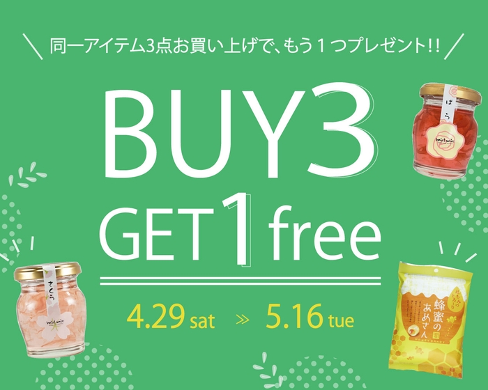 期間中に対象商品をまとめて3個ご購入いただいた方に、同じ商品1個を無料でプレゼント。
