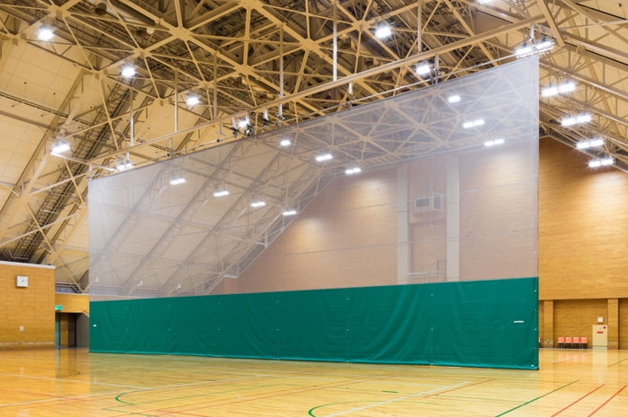 SIKIRUTOは、リモコンのボタンを押すだけで天井に格納されている幕が降り、空間を二つに分けることが出来る、大型電動間仕切りです。当社は1992年に第一号機を納入して以来、日本全国の学校や公共の体育館に納入してきました。
